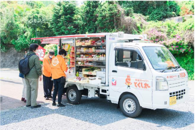 冷蔵機能を備えた軽車両に加工食品、生鮮品、日用品など約400品目1200点積み込んでエリアを巡回して商品を販売する。平日週5日、9:00-16:00の巡回を予定する。