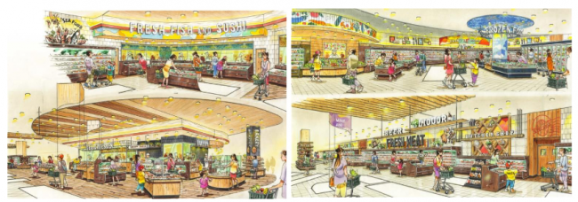マックスバリュおゆみ野店の売場面積は911坪で、スーパーマーケット業態としては広い。この広い売場を活かし、改装では①滞在時間を楽しむ、②お客の五感を刺激する、③お客好みの店、④買物以外の目的が感じられる、の4つを実現する「買物体験型スーパーマーケット」へと刷新する。