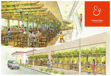 ④買物以外の目的が感じられるスーパーマーケットの取り組みは、オープンカフェ形式のイートイン「Café&Dine(カフェダイン)」を導入する。地域のお客同士が集えるコミュニティの場を提供する。