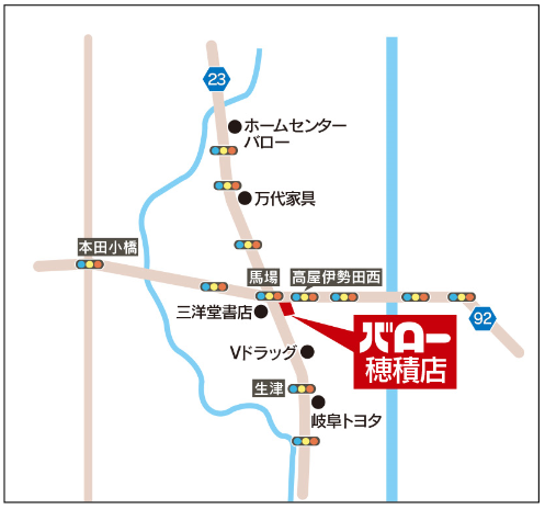 穂積店は、JR東海道線穂積駅から北へ約2kmに位置する。商圏は、周囲の約2万1500世帯・約5万6000人を競ってする。