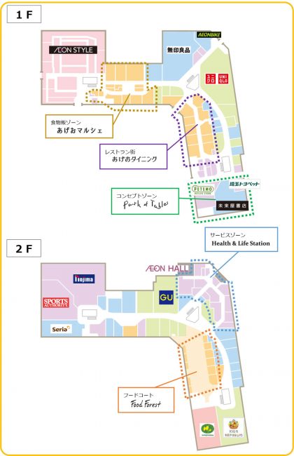 サブ核店舗:無印良品、ユニクロ、GU、未来屋書店、ノジマ、スポーツオーソリティ、セリア、キッズリパブリック