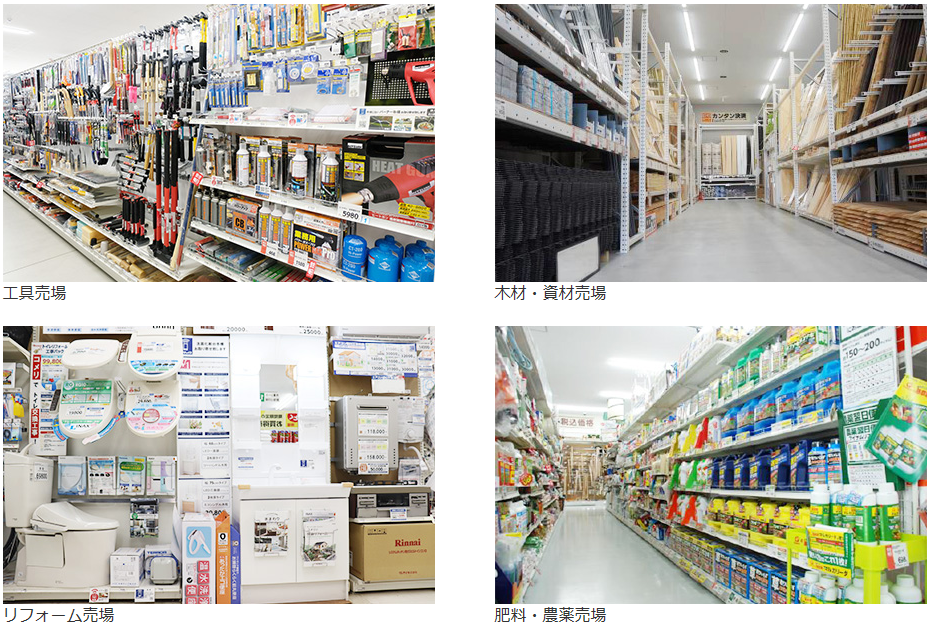 なかでもプロからDIYまで使える建築資材や補修資材などの売場を拡大し、品揃えを充実させている。また肥料・農業資材も品揃えし、家庭菜園から本格農業までに対応する。