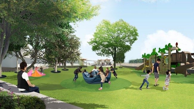 第2が屋外イベントプラザに人工芝と遊具の設置。屋外イベントプラザには、リラックスして過ごせるスペースとして人工芝を設置するほか、遊具「オムニスピナー」「ちびっこマウンテン」を新設する。また、コロナ禍でも三密の不安なく、親が子供を見守りながら楽しんでくつろげるよう、ベンチや飲食用テーブルを設置する。