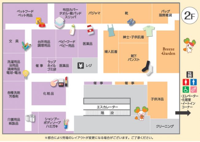 また、衣料品では、肌着・靴下などの実用衣料をはじめ、おしゃれ雑貨の「ブリーズガーデン」を導入する。