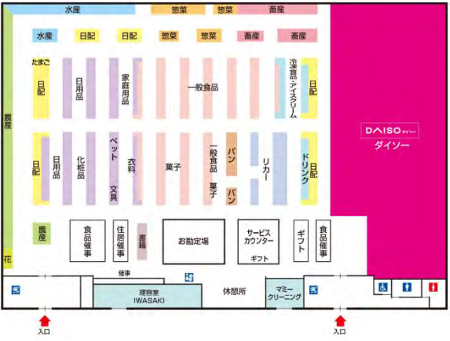 店内レイアウト大幅に変更した。その一つが、別棟にあったダイソーを閉鎖し、店内に配置して集中レジで精算ができるように、お客の利便性を高めた。