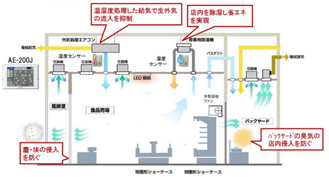 外気処理エアコンは温湿度処理したきれいな空気を取り込み、産業用除湿機と最新の空調設備で店内を換気し、快適な店内環境を実現する。温度と湿度を一定に保つことで、空調設備・冷ケースを効率的に運転させることが可能となる。同社は年間約5万4900kWhの電力量の削減を見込んでいる。