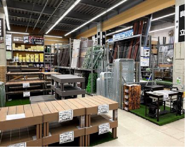 人工木デッキ、ラティス、フェンスを取り扱うウッドデッキ・庭周り資材売場では、売場面積を約50%拡張した。人工木デッキ組立完成品の品揃えを充実させ、関連商品も分かりやすく展開する。