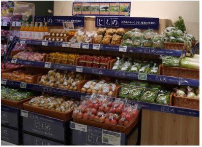 地場野菜や地域の銘産品などを集めた「じもの」コ ーナーを充実させ、生産者から直送の野菜・果物のほか、日配品、加工品など、安全・安心な地元商品を多数品揃えする。