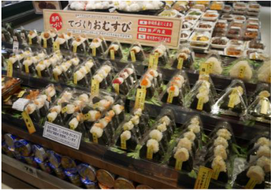 惣菜売場では、昼食や夕食の時間帯に合わせてでき立ての商品をタイムリーに提供する。手づくりおむすび、サラダ、冷惣菜や寿司などの品揃えを強化する。また、小容量など買いやすい量の商品を増やす。