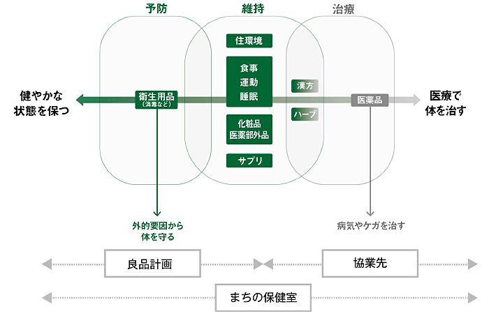 上越市・頸城自動車・良品計画の3者連携包括協定に基づいて、行政・地域医療・地域事業者と連携しながら、地域に根ざした「まちの保健室」を目指す。具体的には、身体の状態を把握し、外的要因から守る「予防」から、心身や環境を整える「維持」、万一の際の薬の提供や健康に関する情報までを網羅した商品とサービスを提供していく。