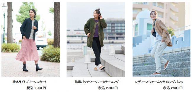 開店当日はワークマンの驚きの機能をもつ秋冬新製品も紹介する。女性向けの汚れに強い撥水プリーツスカート、防風仕様のノーカラーロング、裏フリースのウォームクライミングパンツなど。