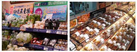 青果売場では地場野菜や地域の銘産品などを集めた「じもの」コーナーを展開する。生産者から直送される野菜・果物、地元商品を多数揃え、地域で生産されたものを地域で消費する「地産地消」を推進していく。