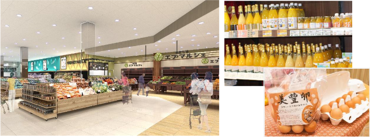 出店地の商圏エリアは昼間人口が多いことや共働きが多い。それに合わせて簡便・即食・時短商品の品揃えを強化する。また昼や夕方の時間に合わせたでき立て惣菜など、お客のライフスタイルに合わせて選べる商品を充実させる。また、採れたての農産物、こだわりたまごや地元加工品・和洋菓子などを集積する地域産品の直売所「エフ・マルシェ」を導入し、「地元の旬のおいしさ」や「新鮮でお得」な商品を展開する。