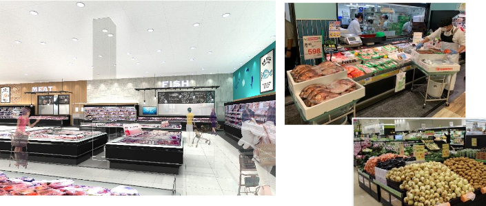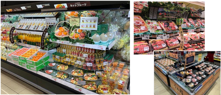 生鮮各コーナーでは、オープンキッチンを導入して市場のような賑わいを演出していく。そのうえで地産地消・旬の商品を拡充する。青果コーナーでは季節ごとのフルーツやカットフルーツ商品を、精肉コーナーでは、こだわりの飼育方法で育てられた伊予牛「絹の味」を、鮮魚コーナー「うお鮨」では、愛媛県産の養殖魚を扱う。