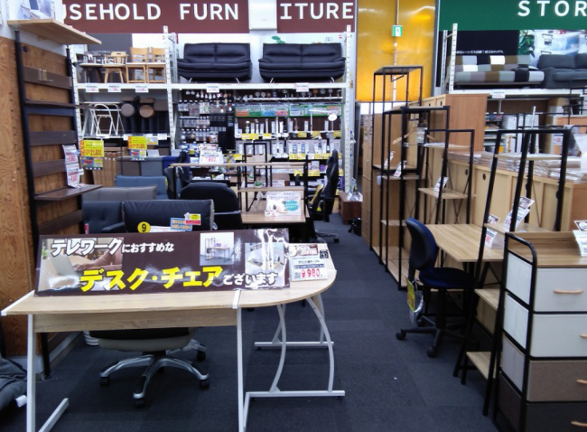 家具・収納売場では、テレワーク売場を展開する。家庭でのデスクワークにおすすめのデスク、チェア、OA機器を提案する。
