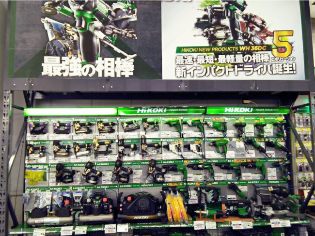 資材館では、⼯具売場と塗料売場をリニューアルする。⼯具売場ではエアー⼯具、プロ⽤ツールバッグ、⼿⼯具1000点以上を新規導⼊する。塗料売場では⾊⾒本を拡充し、選びやすい商品陳列に変更する。エアー⼯具はプロ用のHiKOKIのエアー⼯具を拡充し、ツールバッグも新規商品を取り揃える。