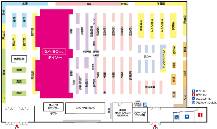 改装では100 円均一のダイソー売場を新規導入した。集中レジで対応する。またレジの待ち時間短縮を図るためにセミセルフレジを新設する。