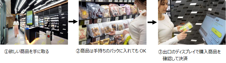 無人決済システムは(株)TOUCH TO GOが開発したものを導入。店内に設置されたカメラなどの情報から入店したお客と手に取った商品をリアルタイムに認識して、お客が出口付近の決済エリアに立つとタッチパネルに自動的に購入商品と合計金額が表示される。現金あるいは電子マネーで支払いをするだけでスピーディに会計が済む。