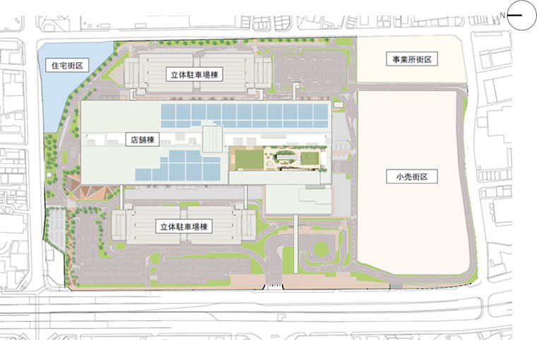 商業施設は、延床面積5万9500坪、店舗面積2万0100坪の4階建てとなる。テナントはブランドやファッションをはじめ、エンターテインメントなど約250店を誘致する。駐車場台数は約4300台の予定。