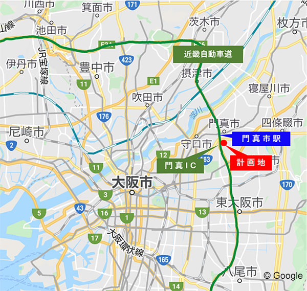 計画地は主要幹線道路である国道163号と大阪中央環状線に接する。また近畿自動車道の門真ICから0.5㎞と至近にあり、中広域からの集客を狙う。京阪本線、大阪モノレール線「門真市駅」から徒歩約8分にあるが、さらに大阪モノレール線の延伸事業に伴うモノレール新駅の設置が隣地に計画されていて、アクセスはさらに向上する見込みだ。