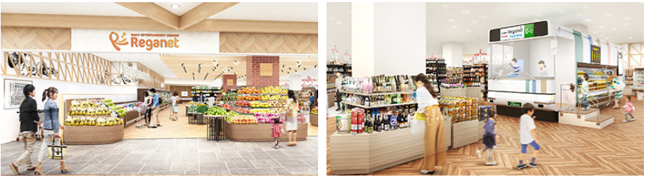 フードマルシェの核店舗となるのは(株)西鉄ストアの新バナー(ブランド)のスーパーマーケット「レガネット DAILY ENTERTAINMENT SQUARE」。同店では、(1)安全・安心で信頼のおける食、(2)家族の健康を支える食、(3)産地や生産者とつながる食、(4)バラエティ豊かな食、(5)季節を感じる旬の食、(6)ちょっとした贅沢感を感じる食という6つの「食」を提案する。