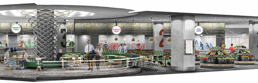また旧青果市場の仲卸が運営する「MARKET 351」がもう一つの核店舗になる。「MARKET 351」は市場のような空間に、産地直送の野菜や肉、魚を揃え、目の前の旬の食材を調理したこだわりのデリやスイーツを提供する。テイクアウトにも対応する。そして産地から直送された旬の農産物などさまざまな食が体験できる約20店舗が出店してマルシェを構成する。