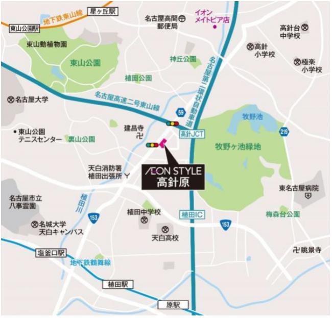同店が立地する名東区高針原エリアは、名古屋市の中心市街地より東側に位置し、東名高速道路名古屋インターチェンジや名古屋第二環状自動車道があることから、名古屋市の玄関口となっている。また観光名所の東山動植物園や木々があふれる牧野ヶ池(まきのがいけ)緑地があって自然にも恵まれている。名古屋高速「高針インター」が近隣にあり、名古屋市中心地、三河・知多エリアへのアクセスにも優れていることから、人口の増加も見込まれている。