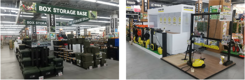 たとえば資材館ではプロフェッショナルのまとめ買い需要に対応するため、各種資材の在庫量を増やし、またフォークリフトでの積み込みスペースを設けている。DIY向けには樹脂ラティスなど、庭廻り資材を新規導入、収納ボックスコーナーも拡大している。