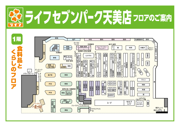 「ライフセブンパーク天美店」では、モール型店舗ならではのごちそうメニューや、味も見た目も楽しめる新商品を品揃えして、同店だけの「限定商品」も販売する。また、顧客が選びやすく買物しやすい売場を目指して、ライフオリジナルのサラダと魚惣菜をそれぞれ集合展開する。メイン入口には惣菜・手づくりパン売場を配置し、時短ニーズに対応する。