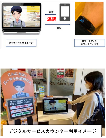 また、小売業界初のスマートウォッチとタッチパネルサイネージを連携した「デジタルサービスカウンター」を新設する。これにより、お客からの問い合わせにリアルで従業員が接客する業務と3Dアバターで完結できるカウンター業務を区分けする。従業員が対応する場合は腕に装着したスマートウォッチに振動が入り、連携したスマートフォンで一次応答、連携操作でお客を待たせず対応できる仕組みだ。それ以外の店内やサービスの案内は、3Dアバターが応対する。