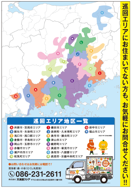 天満屋グループでは今後も「天満屋ハピータウン」「天満屋ハピーズ」の店舗を拠点に事業エリアを拡張するとともに、「移動スーパー とくし丸」事業を通じて、日々の買物支援、各自治体との連携による見守り活動などに取り組み、地域社会への貢献に努めていく。