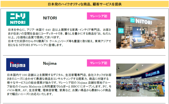ららぽーとBBCCは、グローバルブランドに加えて、日本発の商業施設ならではのネットワークを活かして、NITORI、Nojima、JONETZ by DON DON DONKIなどが出店する。また、日本式の保育・知育を取り入れた保育所Star Childもマレーシア初の施設を開園する。
