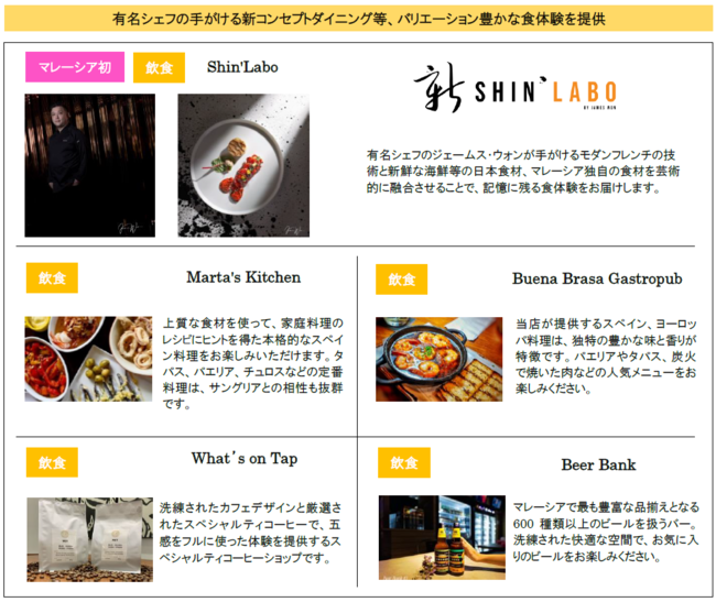 マレーシア初出店やミシュラン掲載実績のある名店、有名シェフが手がける新コンセプトダイニングなど、これまでのショッピングモールにはなかった食の体験を提供する。一方、マレーシアではおなじみのローカルレストランも出店する。