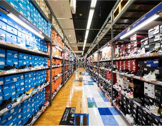 売場の各コーナーでは、最大限商品を陳列する。とくにシューズは約2万点を品揃えする。なかでもナイキ、 ニューバランス、 ホカのランニングシューズは国内最大級の商品量を誇る。