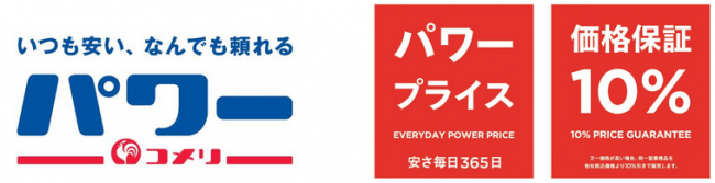コメリパワーでは、店内すべての商品をいつでも低価格の「パワープライス」で販売し、万が一価格が高い場合は同一型番商品を他社税込価格より10%引きで販売する。