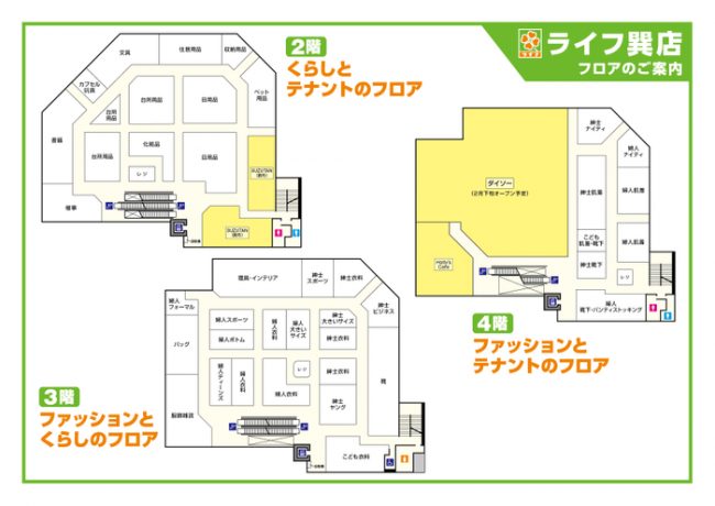 また生活関連売場を2階に移設し、4階には100円ショップ「ダイソー」を2月下旬にオープンする。