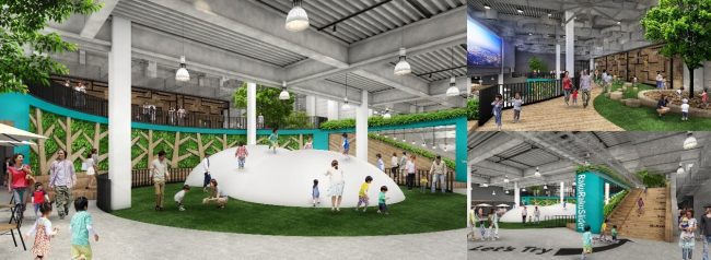 たとえばトランポリンのように飛び跳ねて遊べる「ふわふわドーム」、人の力で音や光を楽しめる「シーソー」「ブランコ」「スピナー」などの次世代遊具が無料で遊べるスペースを設ける。また、絶滅危惧種を救うことをテーマとしたARシューティングゲーム、売上げの一部を地域の子どもたちに寄付するチャリティークレーンなど多種多様なコンテンツを揃える。休憩スポット「ASOBLEカフェ」では、地球環境に配慮したメニューを提供する。