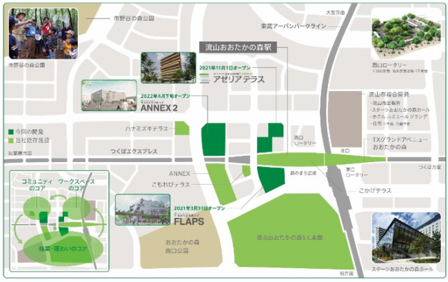また「森のタウンセンター」をコンセプトに開発を進めて、2020年3月31日(水)にオープンした「流山おおたかの森S・C FLAPS」、同11月1日(月)にオープンした「NAGAREYAMA おおたかの森 GARDENSアゼリアテラス」に続く3施設目として、今年6月下旬に「流山おおたかの森S・C ANNEX2」の開業を決定した。キーテナントとして「ニトリ」「角上生鮮市場」「Seria」がオープンする。