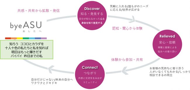 ショップコンセプトは「知ろう ココロとカラダを。十人十色の私たちと私を知れば 明日はもっと輝きだす バイバイ 昨日までの私」。売場は① 知る・発見する②安心・信頼③つながりの3つを感じることができるような構成とする。またピクトグラムを使用し、生理ケア、ゆらぎケア、妊活サポート、マタニティ・チャイルドケア、メノポーズケア、デリケートゾーンケア、セクシャルヘルスケアと7つのカテゴリーでゾーニングする。