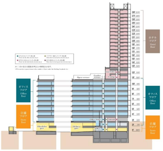 1F~3F:店舗、4F~10F:オフィスフロア、11F~28F:ホテルフロア