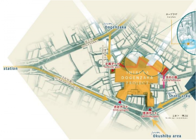 開発エリアは渋谷駅から約400mで、松濤エリア、円山町エリア、渋谷センター街エリアの中間に位置している。同施設は文化村通りの2カ所と、道玄坂小路の1カ所の出入口を設け、敷地の中を通り抜けできる「路(みち)」をつくることで、渋谷の新しい回遊空間を創出する。