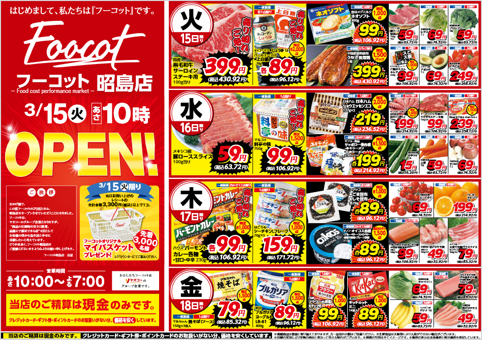 3月15日から18日の3日間、オープンチラシを打って特売アイテムを展開して、地域住民の認知度を上げる。