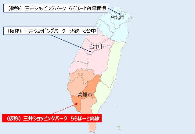 同社は、台中市で2022年に開業予定の「(仮称)三井ショッピングパーク ららぽーと台中」を、台北市で2023年に開業予定の「(仮称)三井ショッピングパーク ららぽーと台湾南港」を開発している。「ららぽーと高雄」は台湾における3施設目の「ららぽーと」事業で、北部、中部に続く、南部のフラッグシップ施設として位置づける。なお、開業済みの「三井アウトレットパーク 台湾林口」、「三井アウトレットパーク 台中港」、「三井アウトレットパーク 台南」を含めると、台湾6施設目の商業施設となる。