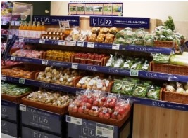 同店は、地場野菜や地域の銘産品などを集めた「じもの」コーナーを充実させ、生産者から直送の新鮮な野菜・果物のほか、日配品、加工品など、安全・安心、新鮮な地元商品を多数品揃えする。地域で生産されたものを地域で消費する「地産地消」を推進する。