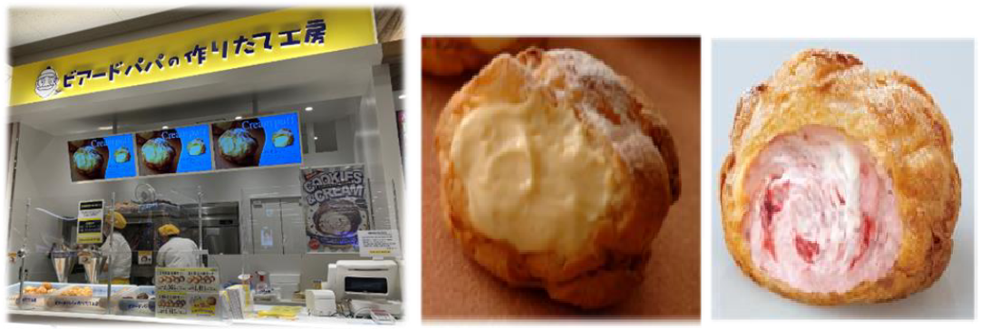 「ビアードパパの作りたて工房」では、シュー生地をオーブンで焼き上げて、注文をもらってから顧客の目の前でクリームを詰める実演販売スタイルだ。でき立て、つくり立てだから、シュー生地の表面はサックリ、中はしっとりともちもちとした食感が特徴だ。