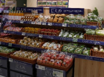 同店は、地場野菜や地域の銘産品などを集めた「じもの」コーナーを充実させ、生産者から直送の新鮮な野菜・果物のほか、日配品、加工品など、安全・安心、新鮮な地元商品を多数品揃えする。地域で生産されたものを地域で消費する「地産地消」を推進する。