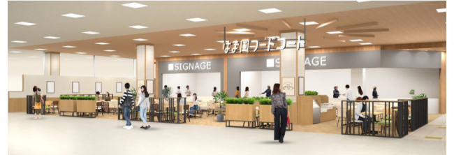 1階に「大阪王将」「ケンタッキー・フライド・チキン」「六鮮(海鮮丼、寿司)」「コスコクレープ」の人気の飲食テナントを新規に導入する。ゆったりとくつろぎながら食事を楽しめる約120席のフードコートを展開する。