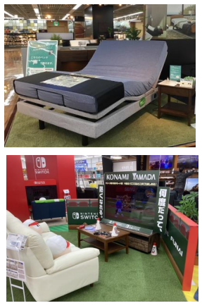 同店の特徴は、家電、家具インテリア、日用品等の品揃えを充実させたこと。一日の疲れを癒やす寝室での新たな生活提案としてヤマダホールディングスが開発した電動ベッドを中心に、エアコンやアロマ等をしつらえた部屋をイメージし、寛ぎのひとときを体感できるコーナーを用意した。また、地域に特化した特徴として、ゲームコーナーでは“広島球場”をイメージした体験コーナーも用意した。