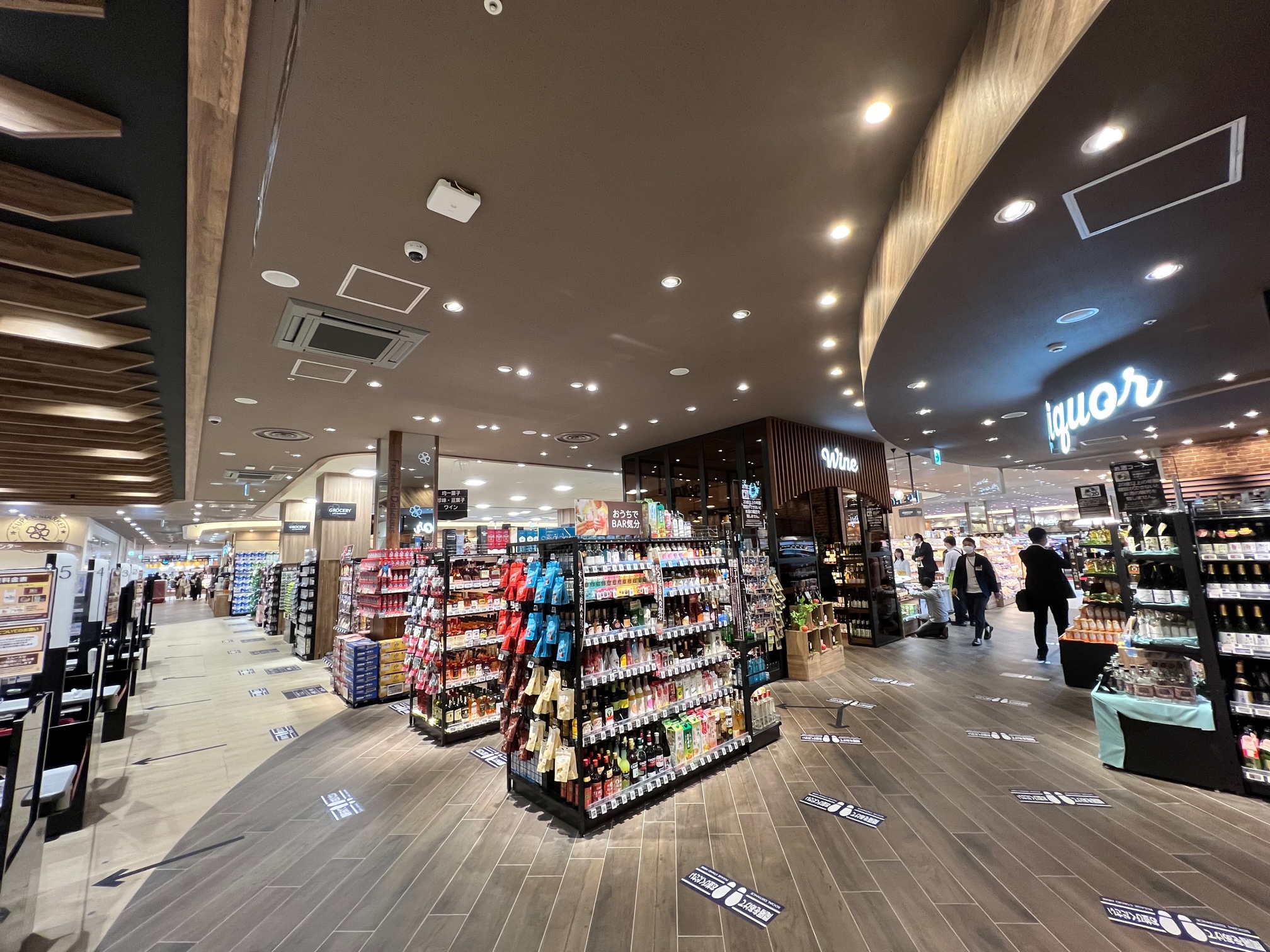 時計周りの動線で、鮮魚、精肉、日配の売場が続き、最後はワインセラーもあるリカーコーナー。レジ前はグロサリーと日用雑貨や家庭用費などの生活関連の商品を集積した。