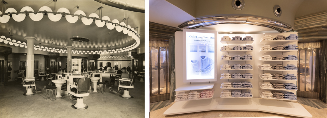 店舗は歴史あるテーラーが軒を連ねるメイフェア地区にもほど近く、19世紀に建てられた指定建造物に入居したことで、新旧のデザインを活かした店舗設計とした。ユニクロ リージェントストリート店は、建造当時の美しい意匠を残した店づくりだ。また1920年代に理髪店だった地下1階のスペースは、当時のアールデコ様式の内装を活かして、オックスフォードシャツやチノパンツなどユニクロを代表する定番商品を展示するスペースにした。